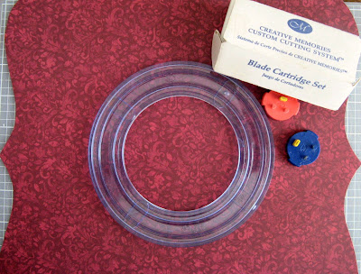 2) I cut the patterned paper into the bracket shape using a pattern I previously traced onto card stock from a purchased piece of card stock. I always make patterns with interesting die cuts in this manner so I can use them over and over again. Then I used my circle cutting system to cut the circle and ring from the middle.